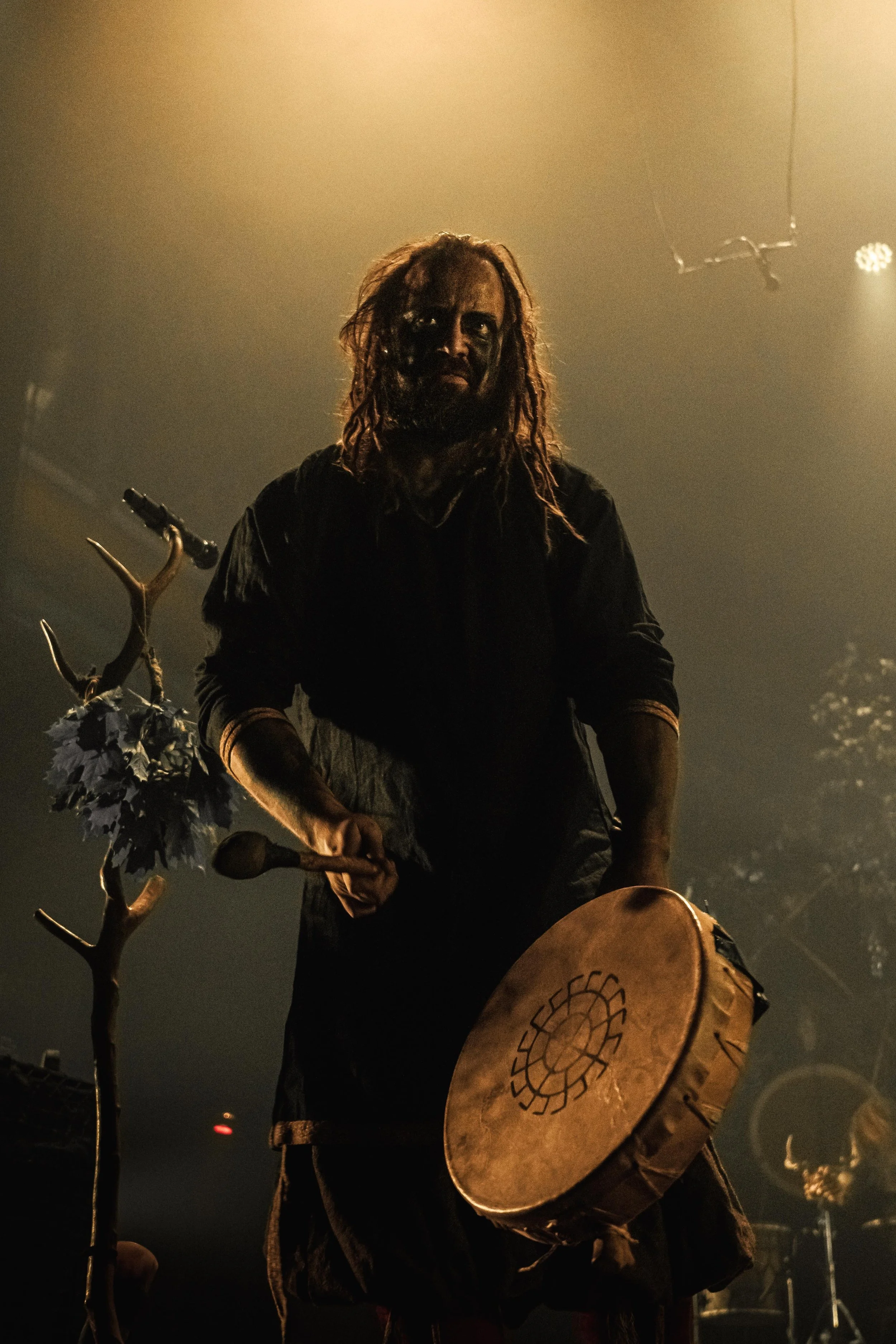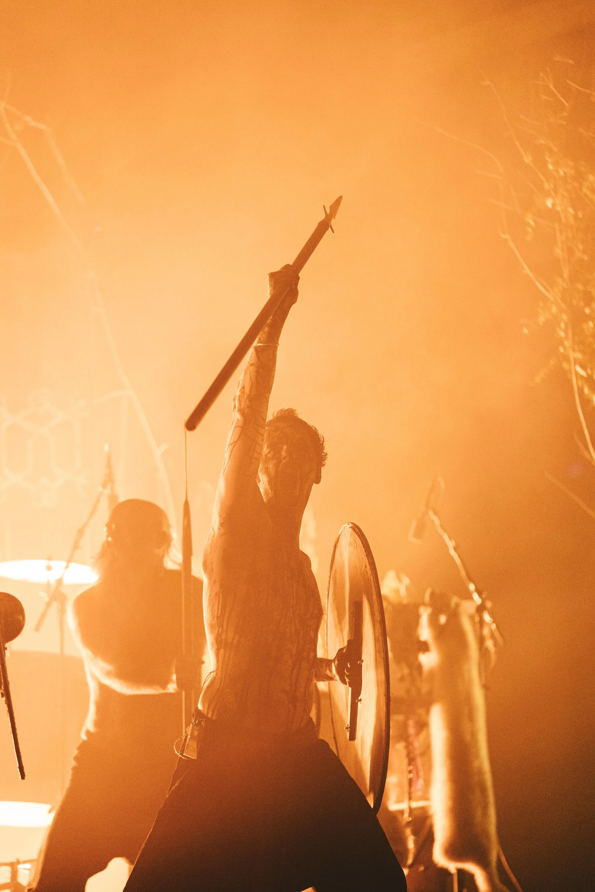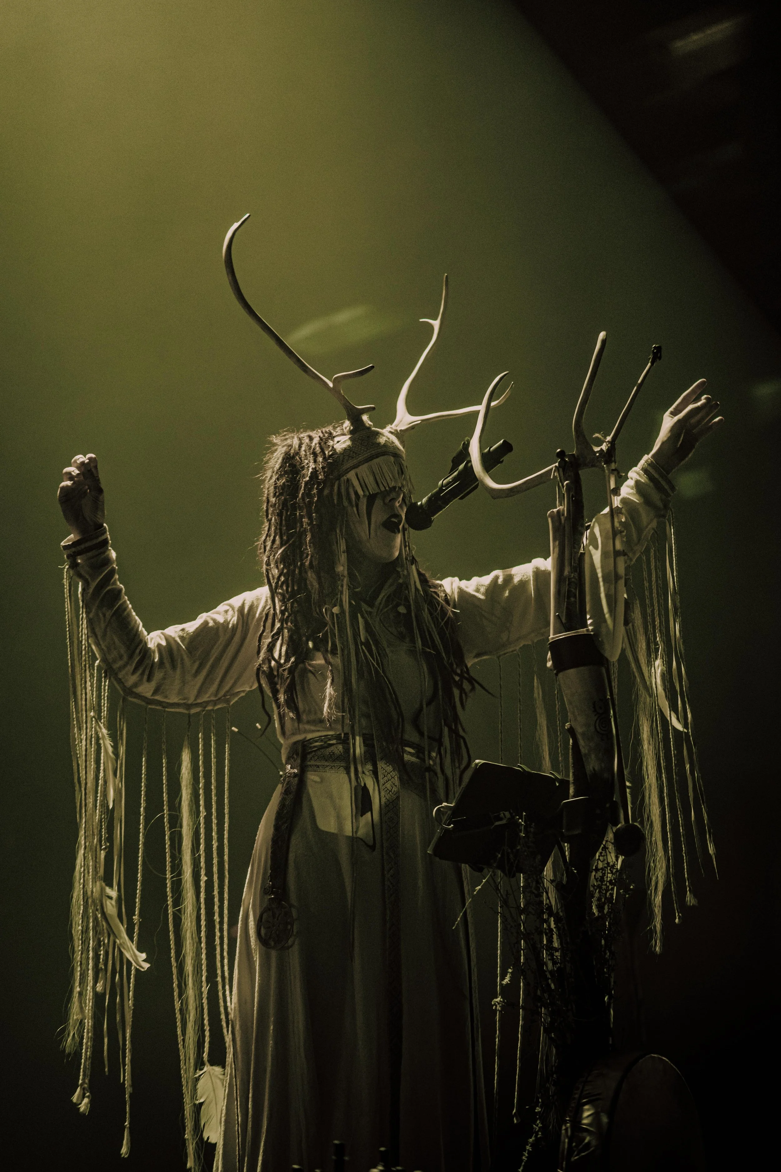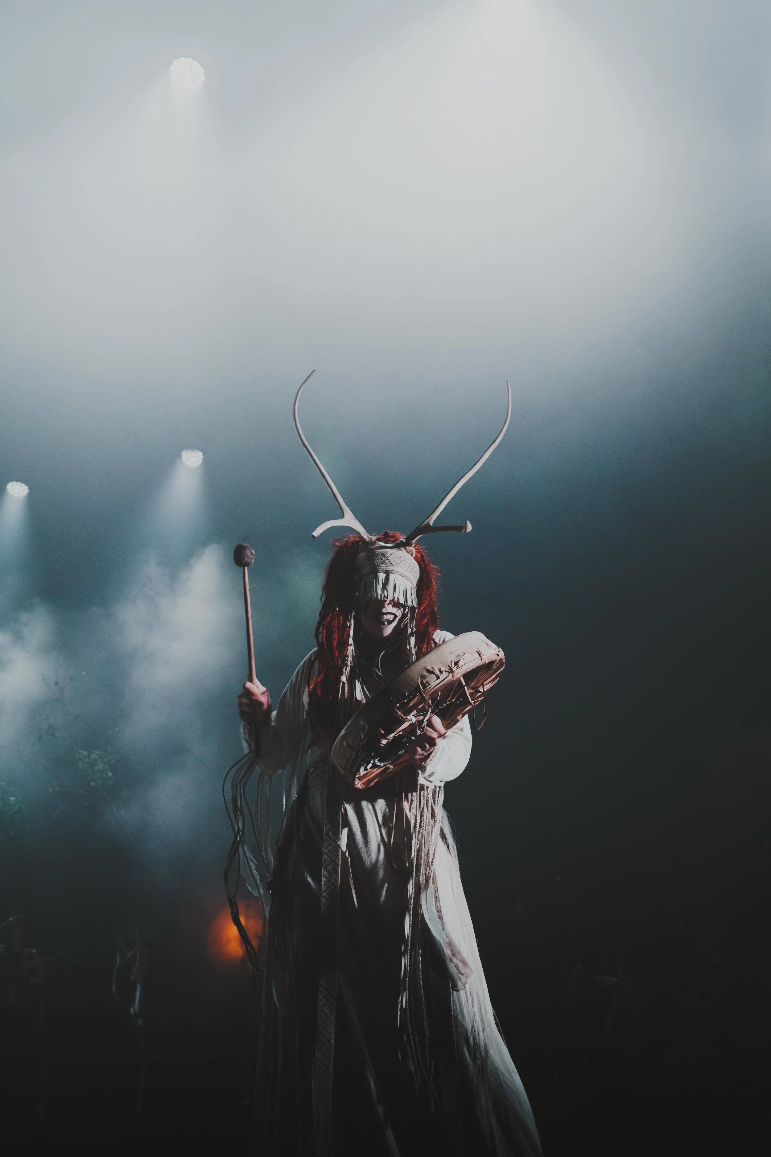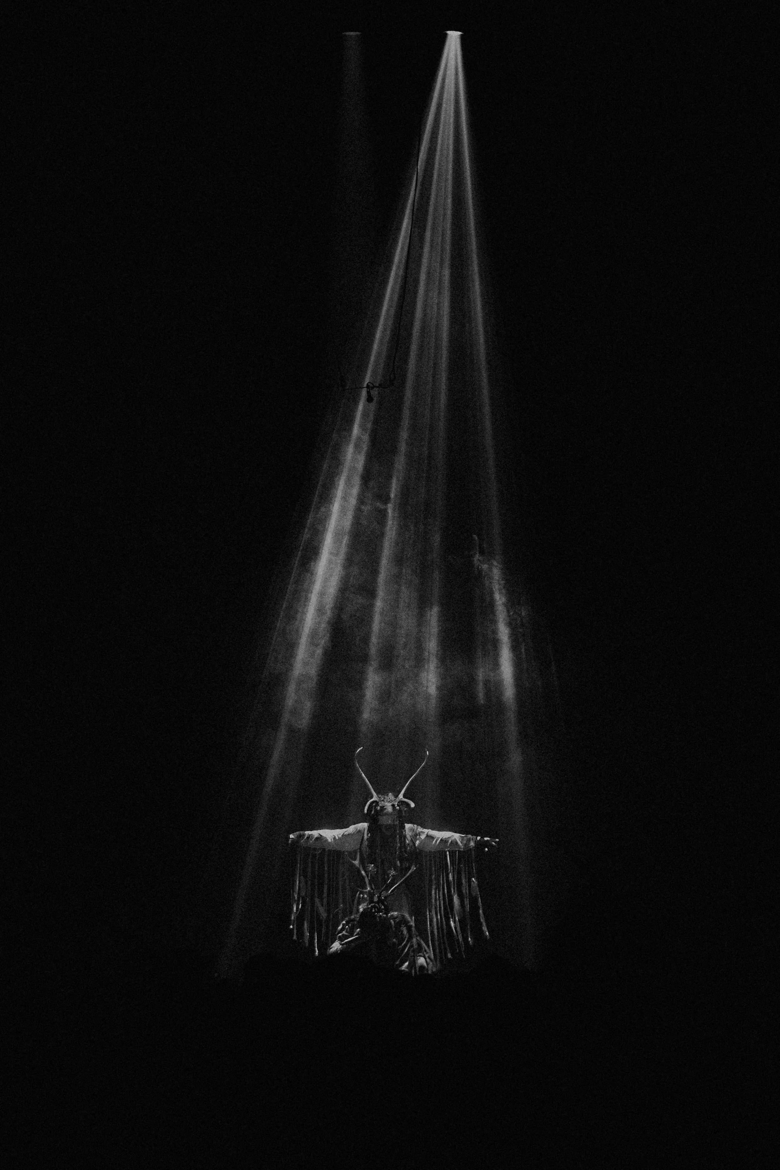 From there, the show erupts into a staggering production, both visually and audibly. Faust’s guttural vocals span a range from reverberating throat singing to an almost hissed aggression. Franz, the lightest figure on stage clad in an ethereal white gown and headdress, complements the roaring of Faust and accompanying warriors with a tenor that is at times angelically cooed and at others rousingly cried out, seeming to invoke whatever gods may have been summoned into the ritual. Juul is stationed at stage left, jumping between the mixing panel, drums, a stringed instrument that I admittedly know nothing about, or leading the accompanying performers – referred to as warriors – in the Hakkerskaldyr chant with staff in hand.